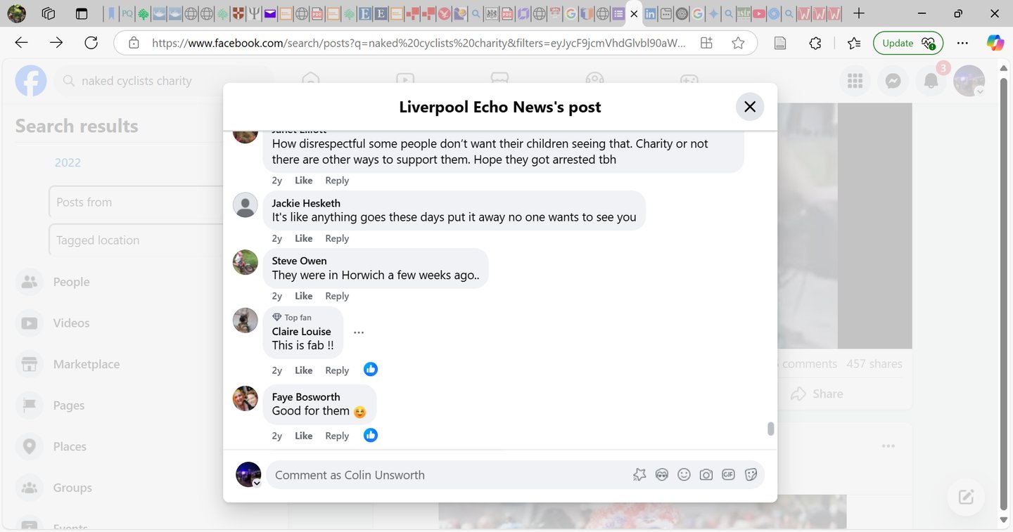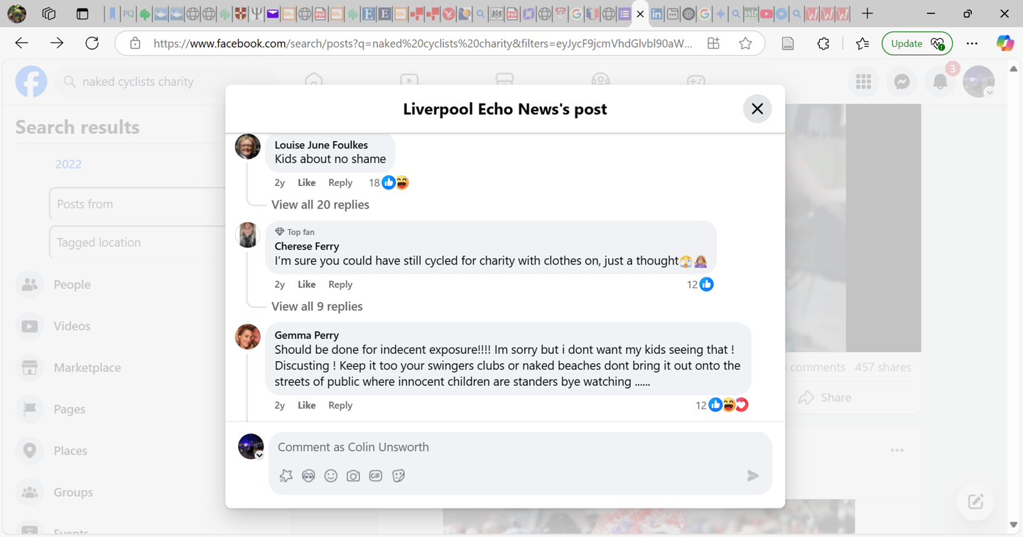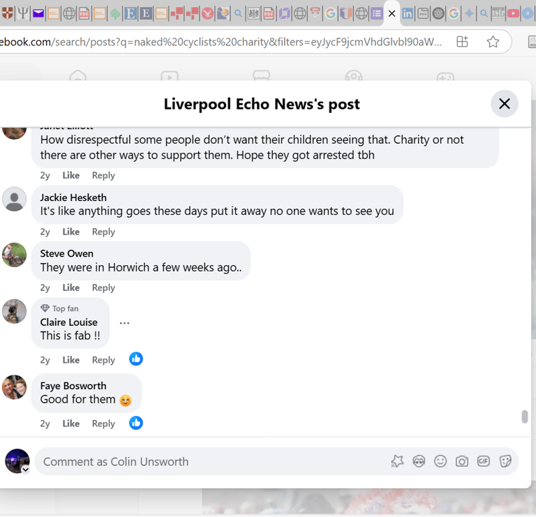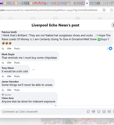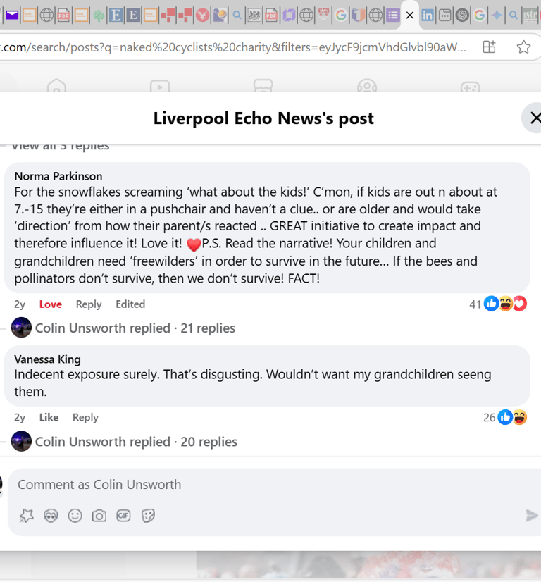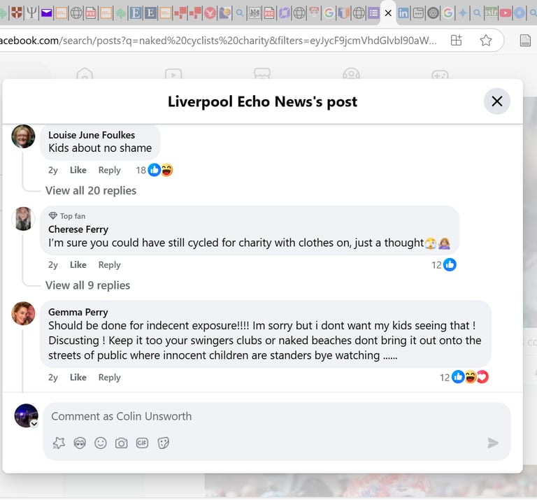 The two main risks of the mission were that the entertainment value of the ride would drown out the message, and that seeing naked people in public would affect negative feelings. There was considerable discussion online, but the set of screenshots from the Liverpool Echo Facebook page (Fig. 4 & 5) summarise the extent to which members of the public were offended or disgusted. The first comments on both screenshots and the last one on the first screenshot (Fig 4), reveal negativity regarding the nakedness and focus on the idea children need to be protected from the perceived harms of nudity. Again, this reiterates engrained societal stress regarding passive nudity.